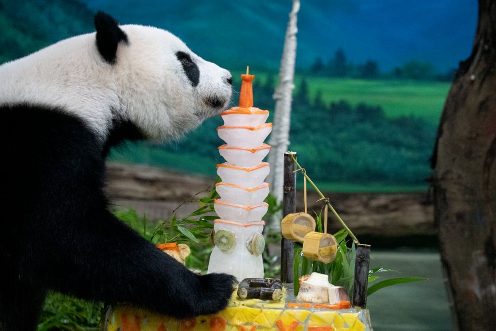 “圓仔”享用保育員準(zhǔn)備的特制“蛋糕”,喜迎10歲生日。(臺(tái)北動(dòng)物園提供/中時(shí)新聞網(wǎng))