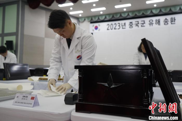 當?shù)貢r間11月22日上午,第十批在韓中國人民志愿軍烈士遺骸裝殮儀式在韓國舉行。圖為韓方工作人員對志愿軍烈士遺骸進行裝殮。中新社記者 劉旭 攝