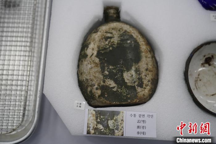 當?shù)貢r間11月22日上午,第十批在韓中國人民志愿軍烈士遺骸裝殮儀式在韓國舉行。圖為裝殮儀式現(xiàn)場拍攝的寫有“孟廣泰”名字的水壺。中新社記者 劉旭 攝