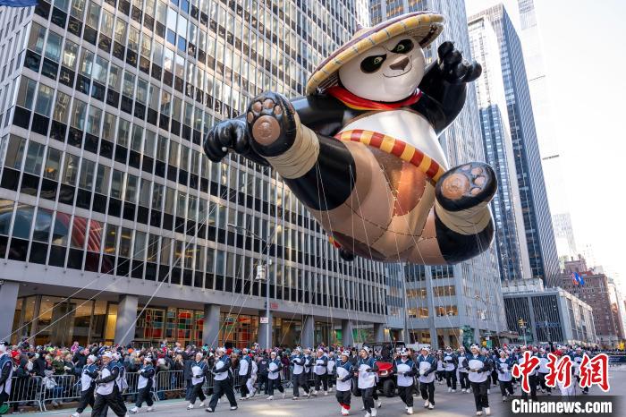 當(dāng)?shù)貢r(shí)間11月23日,第97屆梅西百貨感恩節(jié)大游行在美國(guó)紐約曼哈頓舉行。圖為基于動(dòng)畫電影《功夫熊貓》里阿寶的造型設(shè)計(jì)的巨型氣球行進(jìn)在曼哈頓街頭?!≈行律缬浾?王帆 攝