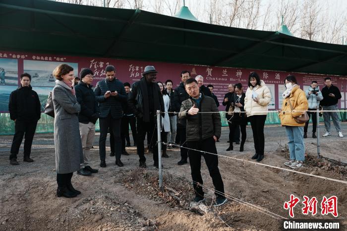 駐華使節(jié)、外交官和外國(guó)地方駐華機(jī)構(gòu)代表在賀蘭神酒莊了解葡萄藤埋土工作。 中新網(wǎng)記者 崔楠 攝