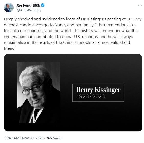 謝鋒寫道,“得知基辛格博士去世,享年100歲,我深感震驚和悲痛。我向南希(基辛格夫人)以及她的家人致以最深切的哀悼。這對我們(中美)兩國和世界來說都是巨大的損失。歷史將銘記這位百歲老人為中美關(guān)系作出的貢獻,他將作為最珍貴的老朋友,永遠活在中國人民心中。”