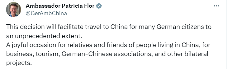 德國駐華大使傅融(Patricia Flor)在社交媒體平臺(tái)寫道:“這一決定將在前所未有的程度上為德國公民前往中國帶來便利。無論是在華的商務(wù)人士、旅游人士、德中協(xié)會(huì)以及從事其他雙邊項(xiàng)目的朋友,這都是一個(gè)歡樂時(shí)刻?!?/p>