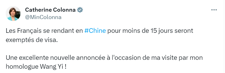 法國外長(zhǎng)科隆納也表示:“我的同事王毅在我訪問之際宣布了一個(gè)很棒的消息!前往中國停留不超過15天的法國人將免簽?!?/p>