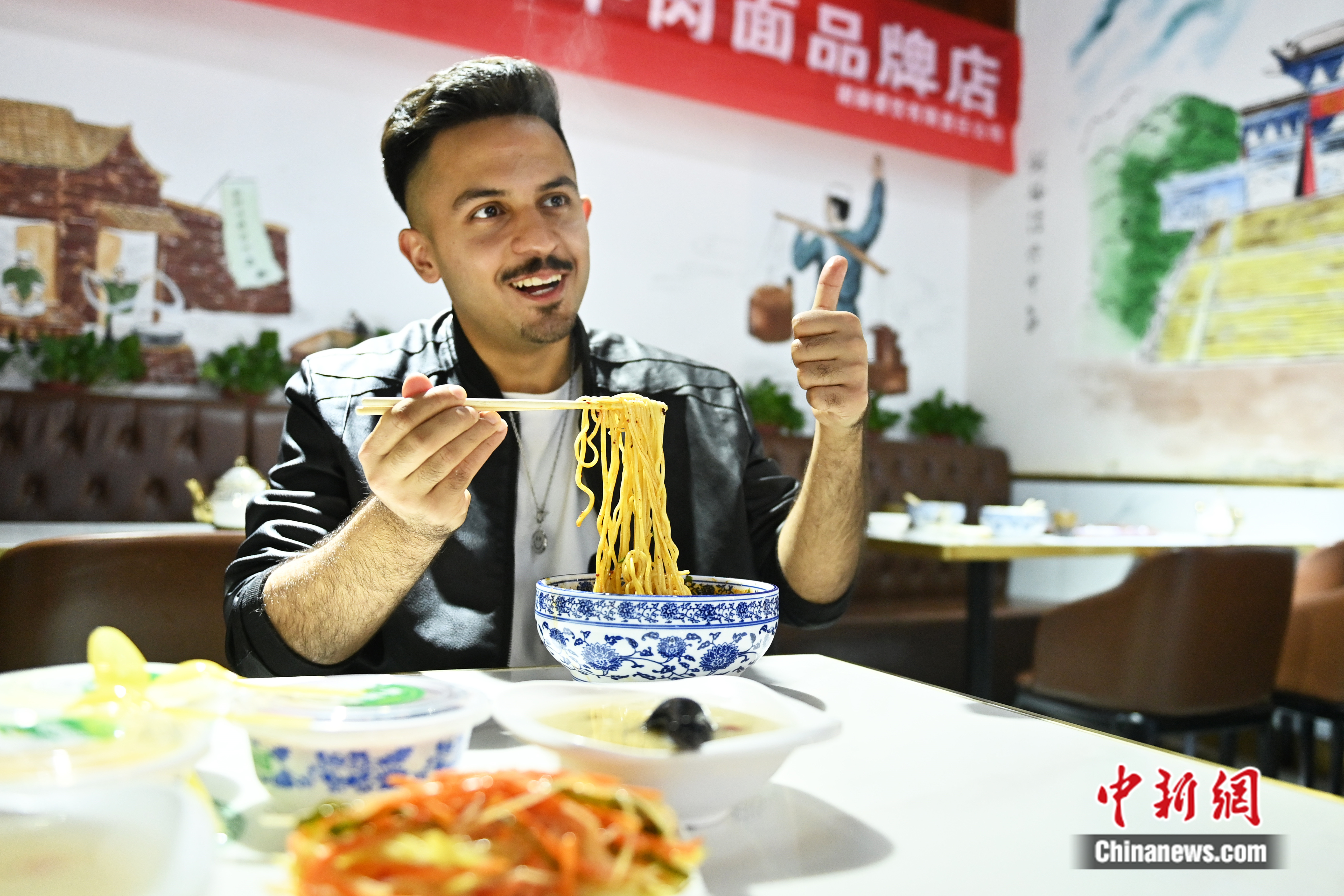 蘭州理工大學留學生潘迪在面館點贊蘭州美食。中新網(wǎng)記者 李亞龍 攝