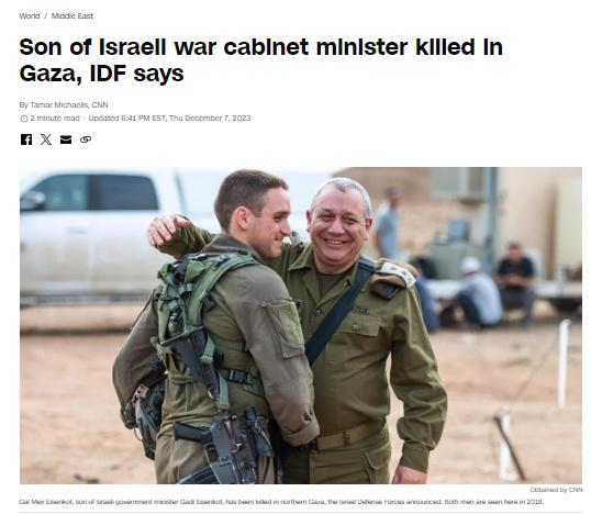 中新網(wǎng)12月8日電 綜合外媒報道,當?shù)貢r間7日,以色列國防軍表示,以色列內(nèi)閣部長、前國防軍參謀長加迪·埃曾科特的兒子在加沙地帶北部的戰(zhàn)斗中喪生。