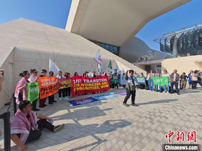 12月9日,阿聯(lián)酋迪拜,抗議者在聯(lián)合國(guó)氣候變化迪拜大會(huì)藍(lán)區(qū)會(huì)場(chǎng)集會(huì)并呼吁公正轉(zhuǎn)型?!≈行律缬浾?龐無(wú)忌 攝