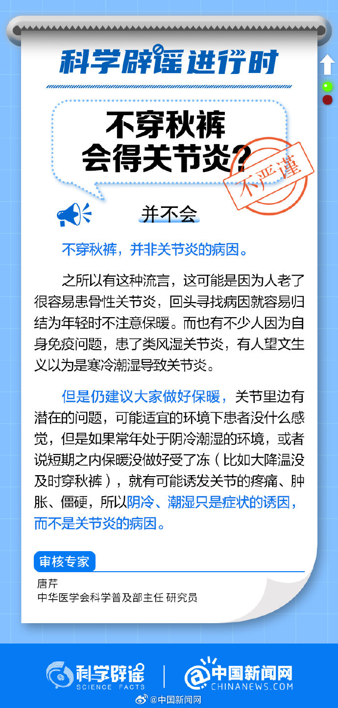 中新網(wǎng)12月11日電 不穿秋褲,并非關(guān)節(jié)炎的病因。之所以有這種流言,這可能是因?yàn)槿死狭撕苋菀谆脊切躁P(guān)節(jié)炎,回頭尋找病因就容易歸結(jié)為年輕時(shí)不注意保暖。而也有不少人因?yàn)樽陨砻庖邌?wèn)題,患了類(lèi)風(fēng)濕關(guān)節(jié)炎,有人望文生義以為是寒冷潮濕導(dǎo)致關(guān)節(jié)炎。但陰冷、潮濕是疼痛、僵硬等關(guān)節(jié)炎癥狀的誘因(而不是病因),仍建議大家做好保暖。(來(lái)源:@科學(xué)辟謠 @中國(guó)新聞網(wǎng))