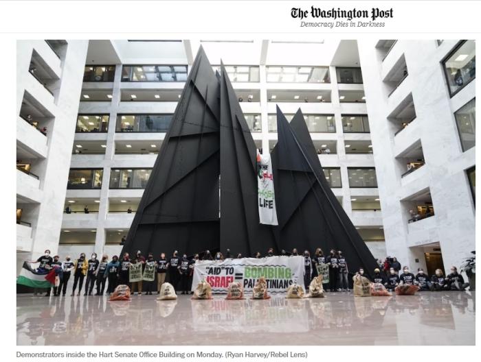 報(bào)道稱(chēng),抗議者身穿寫(xiě)有“立即停止(援助)武器”字樣的黑色T恤,高喊“立即?;穑×⒓赐;?!”。他們還舉著寫(xiě)有“援助以色列=轟炸巴勒斯坦人”的條幅。