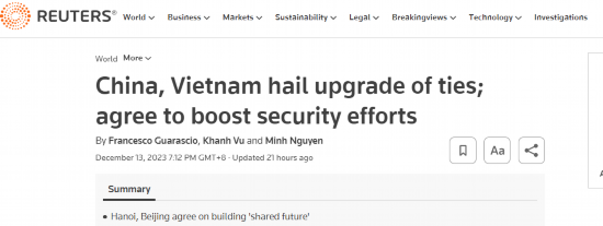 路透社12月13日報(bào)道稱,中國和越南宣布,兩國簽署了數(shù)十項(xiàng)合作協(xié)議,同意加強(qiáng)安全事務(wù)合作,共同構(gòu)建“命運(yùn)共同體”。