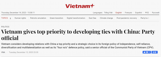 中國日報(bào)網(wǎng)12月14日電 12月12日,中國和越南共同宣布中越兩黨兩國關(guān)系新定位,在深化中越全面戰(zhàn)略合作伙伴關(guān)系基礎(chǔ)上,攜手構(gòu)建具有戰(zhàn)略意義的中越命運(yùn)共同體。國際媒體對中越關(guān)系新定位進(jìn)行了密集報(bào)道,認(rèn)為雙邊關(guān)系更加重要,中越兩黨兩國關(guān)系邁上新臺階。