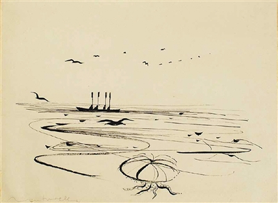 在人物肖像之外,萬(wàn)徒勒里也熱衷于描繪中國(guó)山水。他于1954年創(chuàng)作的《長(zhǎng)江》借鑒了中國(guó)水墨丹青技法,整幅畫作視野開(kāi)闊,體現(xiàn)出中國(guó)水墨畫的朦朧、婉約與詩(shī)意。他在客居瑞士期間的畫作同樣展現(xiàn)中國(guó)水墨畫開(kāi)闊的構(gòu)圖、精巧的線條和獨(dú)具一格的東方美學(xué)。畫作《歸來(lái)》通過(guò)南飛的歸雁、孤寥的漁船和茫茫無(wú)盡的海面,讓觀者感受到一種難以訴諸語(yǔ)言、始終縈繞心頭的鄉(xiāng)愁。