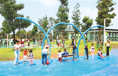 埃塞俄比亞首都亞的斯亞貝巴河岸綠色發(fā)展項目是由中國援助的工程,包括整治城市河道、在河道周邊修建公園和其他公共設(shè)施等。圖為當?shù)睾⒆觽冊趤喌乃箒嗀惏秃影毒G色發(fā)展項目的兒童樂園玩耍。