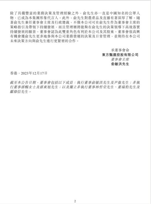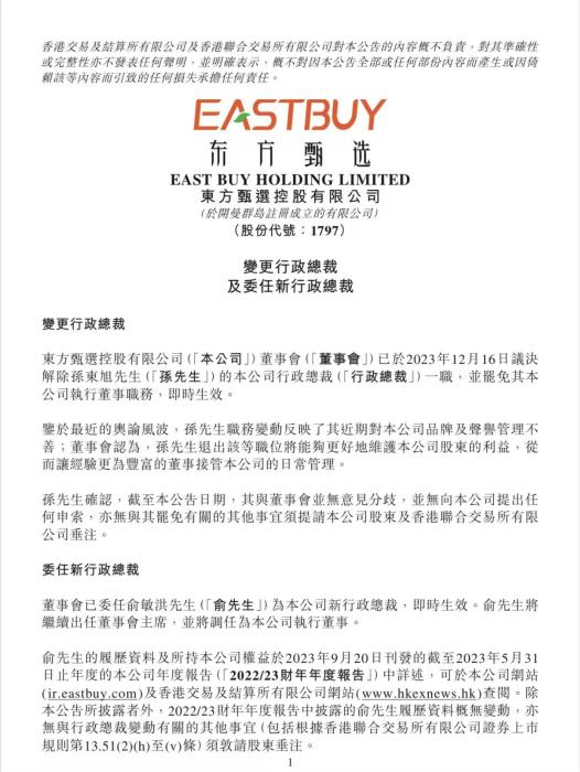 中新網(wǎng)12月18日電 12月18日,東方甄選開盤后股價(jià)大漲,截至發(fā)稿時(shí),漲超10%。當(dāng)日凌晨,東方甄選微博賬號(hào)發(fā)布的直播預(yù)告海報(bào)顯示,董宇輝的身份已成為“東方甄選高級(jí)合伙人”。12月17日,東方甄選發(fā)布公告稱,董事會(huì)已于12月16日議決解除孫東旭的行政總裁一職,并罷免其公司執(zhí)行董事職務(wù),即時(shí)生效。(中新財(cái)經(jīng))