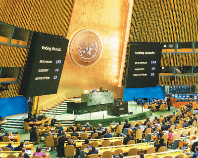 2023年12月12日,聯(lián)合國大會緊急特別會議投票通過決議,要求在加沙地帶立即實現(xiàn)人道主義?;?。圖為會議投票現(xiàn)場。