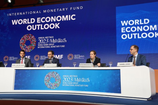 這是2023年10月10日在摩洛哥馬拉喀什拍攝的《世界經(jīng)濟(jì)展望報(bào)告》發(fā)布會(huì)現(xiàn)場(chǎng)。新華社記者霍晶攝