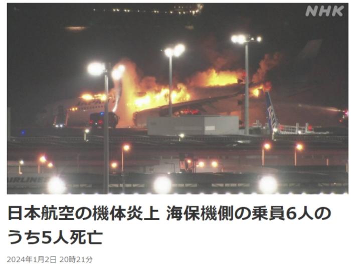 中新網(wǎng)1月2日電 據(jù)日本廣播協(xié)會(NHK)報道,東京警視廳的消息稱,與日航客機相撞的海上保安廳固定翼飛機上5人已確認死亡,機長被確認受重傷。