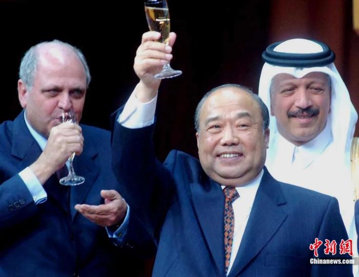 2001年11月12日,中國(guó)加入WTO議定書(shū)簽字儀式在卡塔爾首都多哈舉行,時(shí)任外經(jīng)貿(mào)部部長(zhǎng)石廣生在簽字后同各國(guó)代表一起舉杯慶祝。錢(qián)興強(qiáng) 攝