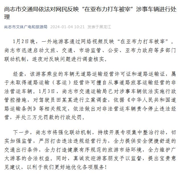 經(jīng)查,該游客乘坐的車輛無道路運輸經(jīng)營許可證和道路運輸證,屬于未取得道路運輸(客運)經(jīng)營許可擅自從事道路旅客運輸經(jīng)營的非法營運車輛。1月3日,尚志市交通運輸局已對涉事車輛依法實施行政管控措施,對駕駛員田某某進行立案調(diào)查,依據(jù)《中華人民共和國道路運輸條例》等相關(guān)規(guī)定,依法做出對非法營運車輛責令停止違法經(jīng)營,并處三萬元罰款的行政處罰。