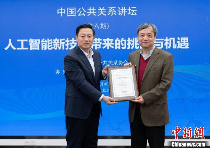 1月8日,中國公共關(guān)系講壇在北京舉行。圖為講壇結(jié)束后,中國公共關(guān)系協(xié)會會長郭衛(wèi)民(左)向演講嘉賓、清華大學(xué)人工智能研究院常務(wù)副院長孫茂松頒發(fā)榮譽(yù)證書。 中國公共關(guān)系協(xié)會供圖。