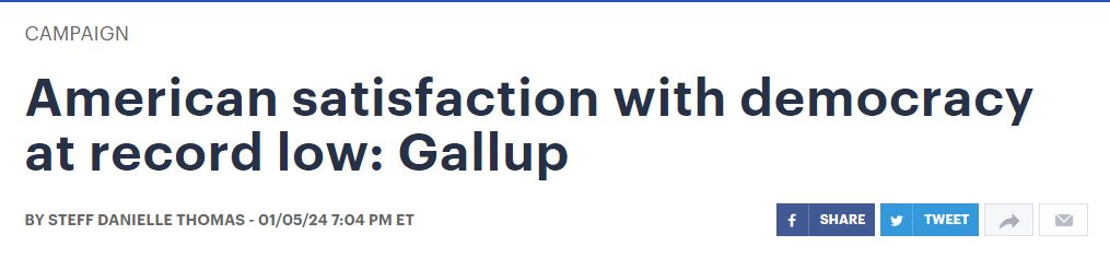 中國日報網1月8日電 據(jù)美國《國會山報》網站5日報道,蓋洛普公司(Gallup)5日公布的民調顯示,只有28%的美國成年人對該國的民主現(xiàn)狀感到滿意,較2021年1月6日美國“國會山騷亂”事件發(fā)生后不久的35%的調查結果又有了明顯的下降,創(chuàng)歷史新低。