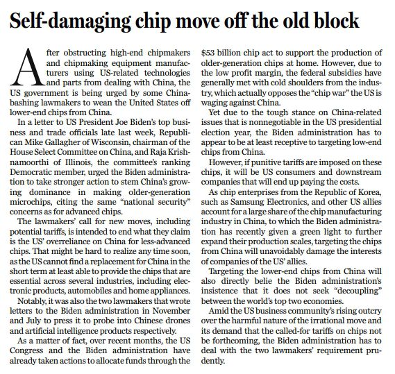 美國(guó)部分國(guó)會(huì)議員近期再次炒作中國(guó)芯片安全威脅,其行動(dòng)可以說是“理智不多但傷害性不小”,加上所謂追加關(guān)稅的要求,更是在美國(guó)企業(yè)界激起極大反對(duì)之聲。與中國(guó)“脫鉤斷鏈”最終只會(huì)得不償失,究竟如何應(yīng)對(duì),奉勸拜登政府還是審慎而行。