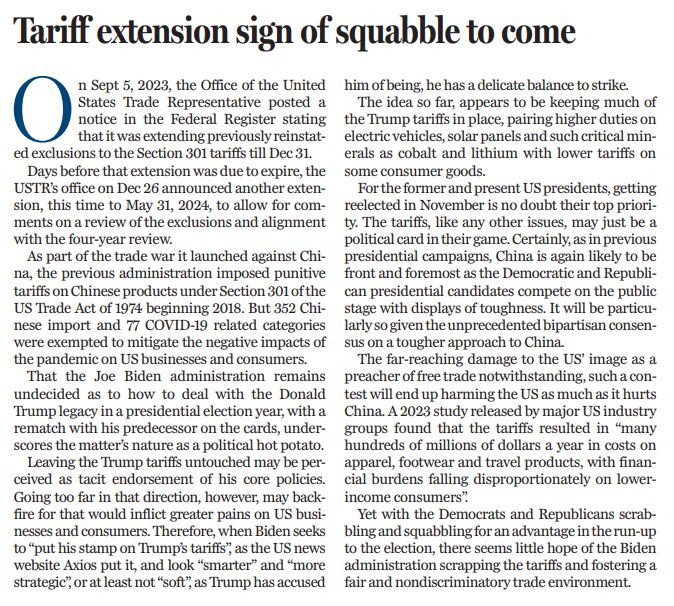 美國貿(mào)易代表辦公室近期宣布,進一步延長對352項已恢復(fù)豁免的中國進口商品和77種與新冠防疫相關(guān)的中國商品的301條款關(guān)稅豁免期,期限由2023年12月31日延至2024年5月31日。