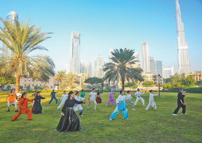 每到周末,世界最高建筑——阿聯(lián)酋迪拜哈利法塔附近的草坪上,一群身穿中式練功服的民眾排成隊列,伴著舒緩的中國古典民樂,起勢、野馬分鬃、白鶴亮翅……如今,越來越多民眾自發(fā)前來學(xué)習(xí)太極拳、太極劍、太極扇等,經(jīng)常性參加太極拳練習(xí)活動的就有來自50多個國家和地區(qū)的近200人。