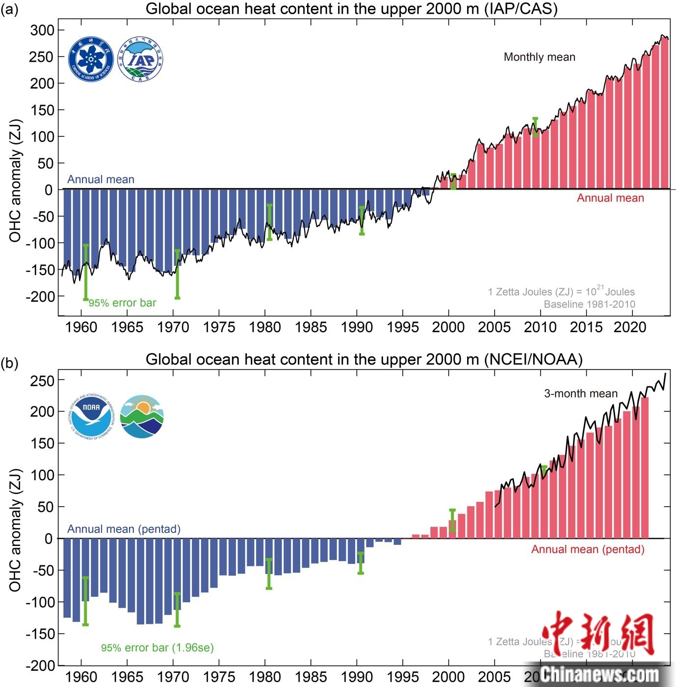 1958-2023年全球海洋上層2000米熱含量變化時(shí)間序列:上圖為IAP/CAS數(shù)據(jù);下圖為NOAA/NCEI數(shù)據(jù)。中國科學(xué)院大氣物理研究所/供圖