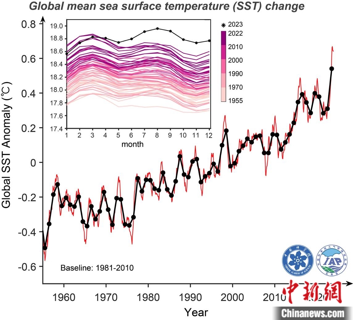 根據(jù)IAP/CAS溫度數(shù)據(jù)產(chǎn)品(1米層)分析的1955年至2023年12月全球平均海表溫度變化。黑線為年均值,紅色為月均值;異常值為相對于1981-2010年常年值;左上角內(nèi)框?yàn)楹1頊囟鹊募竟?jié)變化。中國科學(xué)院大氣物理研究所/供圖
