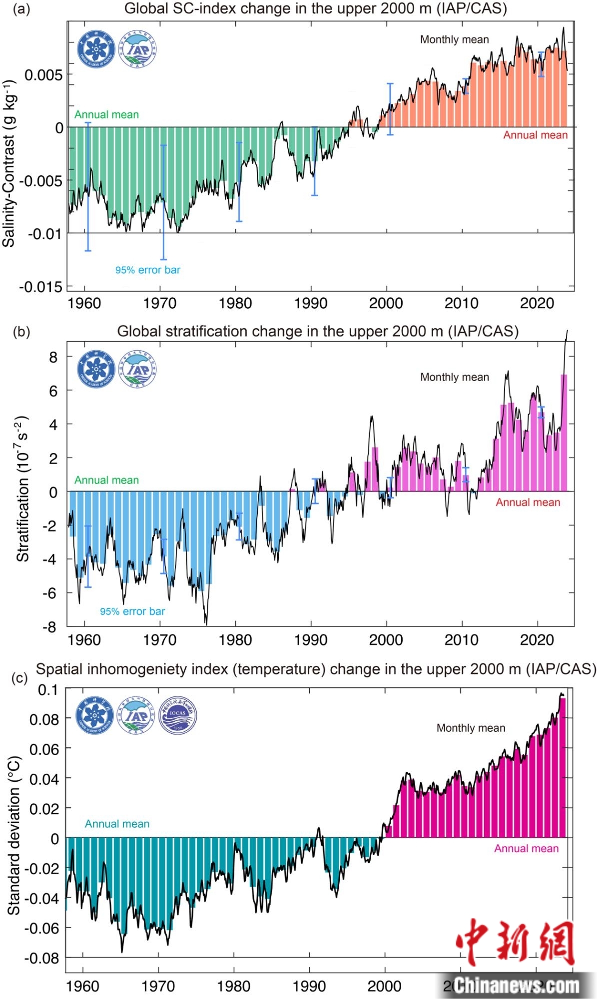 1958-2023年全球海洋上層2000米鹽度差指數(shù)SC(a)、層結(jié)(b)、溫度空間非均勻性指數(shù)(c)變化時(shí)間序列。黑色線條為月度變化,條狀色條為年變化。中國科學(xué)院大氣物理研究所/供圖