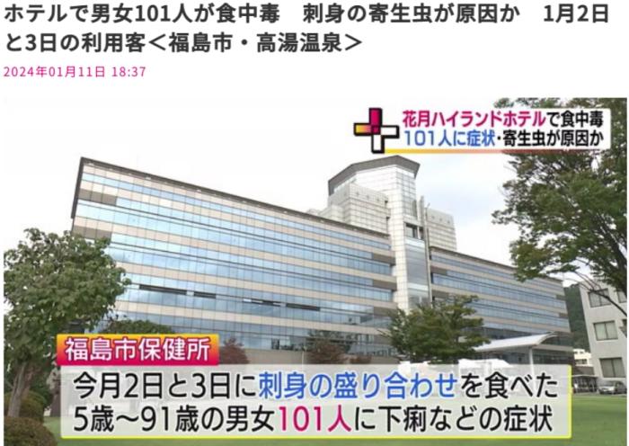 報(bào)道稱(chēng),中毒者年齡下至5歲,上至91歲。保健所在調(diào)查中發(fā)現(xiàn)該酒店提供的魚(yú)類(lèi)刺身上檢測(cè)出寄生蟲(chóng),并認(rèn)為這就是導(dǎo)致此次食物中毒的原因。