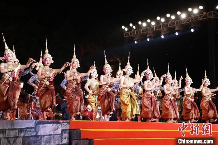 1月13日晚,“中柬人文交流年”啟動儀式在柬埔寨暹粒舉行。圖為柬埔寨舞蹈藝術家表演傳統(tǒng)舞蹈。 中新社發(fā) 黎海月 攝