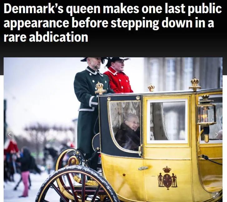 當?shù)貢r間1月4日,是丹麥女王瑪格麗特二世最后一次以君主身份公開露面?,F(xiàn)年83歲的女王乘坐“金馬車”穿過丹麥首都,不少民眾冒著嚴寒、強風和雨雪,在沿途為她揮舞旗幟并歡呼。