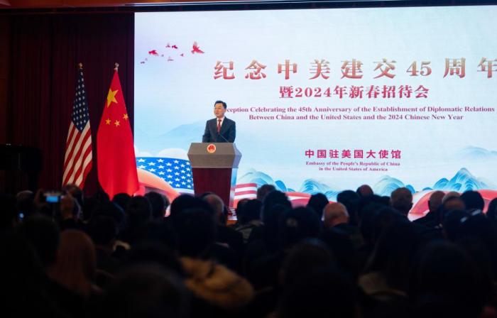 當(dāng)?shù)貢r間1月16日晚,中國駐美國使館隆重舉辦紀(jì)念中美建交45周年暨新春招待會。謝鋒大使出席并發(fā)表致辭。
