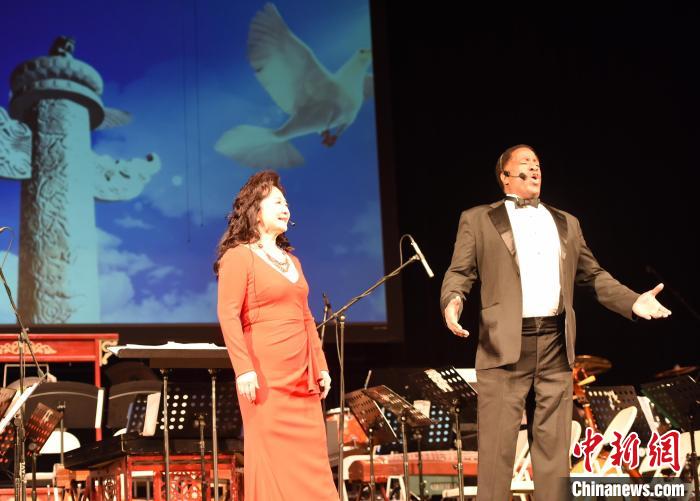 當(dāng)?shù)貢r(shí)間1月27日晚,以紀(jì)念中美建交45周年為主題的鷹飛龍騰新年音樂會(huì)在美國洛杉磯唱響。圖為中美兩國歌唱家聯(lián)袂演唱《我愛你中國》?!≈行律缬浾?張朔 攝
