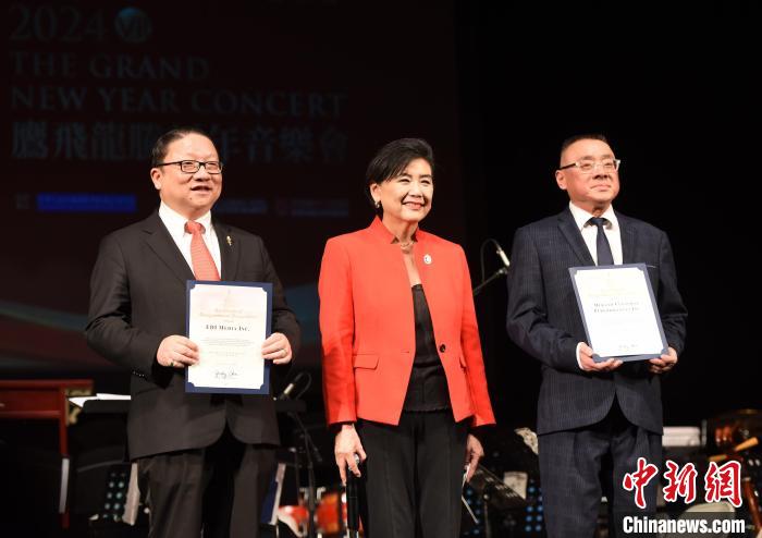 當(dāng)?shù)貢r(shí)間1月27日晚,以紀(jì)念中美建交45周年為主題的鷹飛龍騰新年音樂會(huì)在美國洛杉磯唱響。圖為美國聯(lián)邦眾議員趙美心(中)向美國鷹龍傳媒董事長蘇彥韜(左)等主辦方代表頒發(fā)賀狀。 中新社記者 張朔 攝