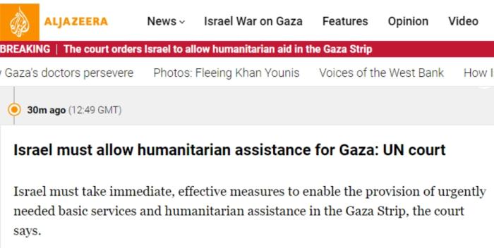 卡塔爾半島電視臺稱,國際法院責(zé)成以色列采取更多措施保護(hù)巴勒斯坦人,但沒有命令其結(jié)束在加沙地帶的軍事行動。此外,國際法院要求以色列在一個月內(nèi)就其已采取的行動向國際法院提交報告。