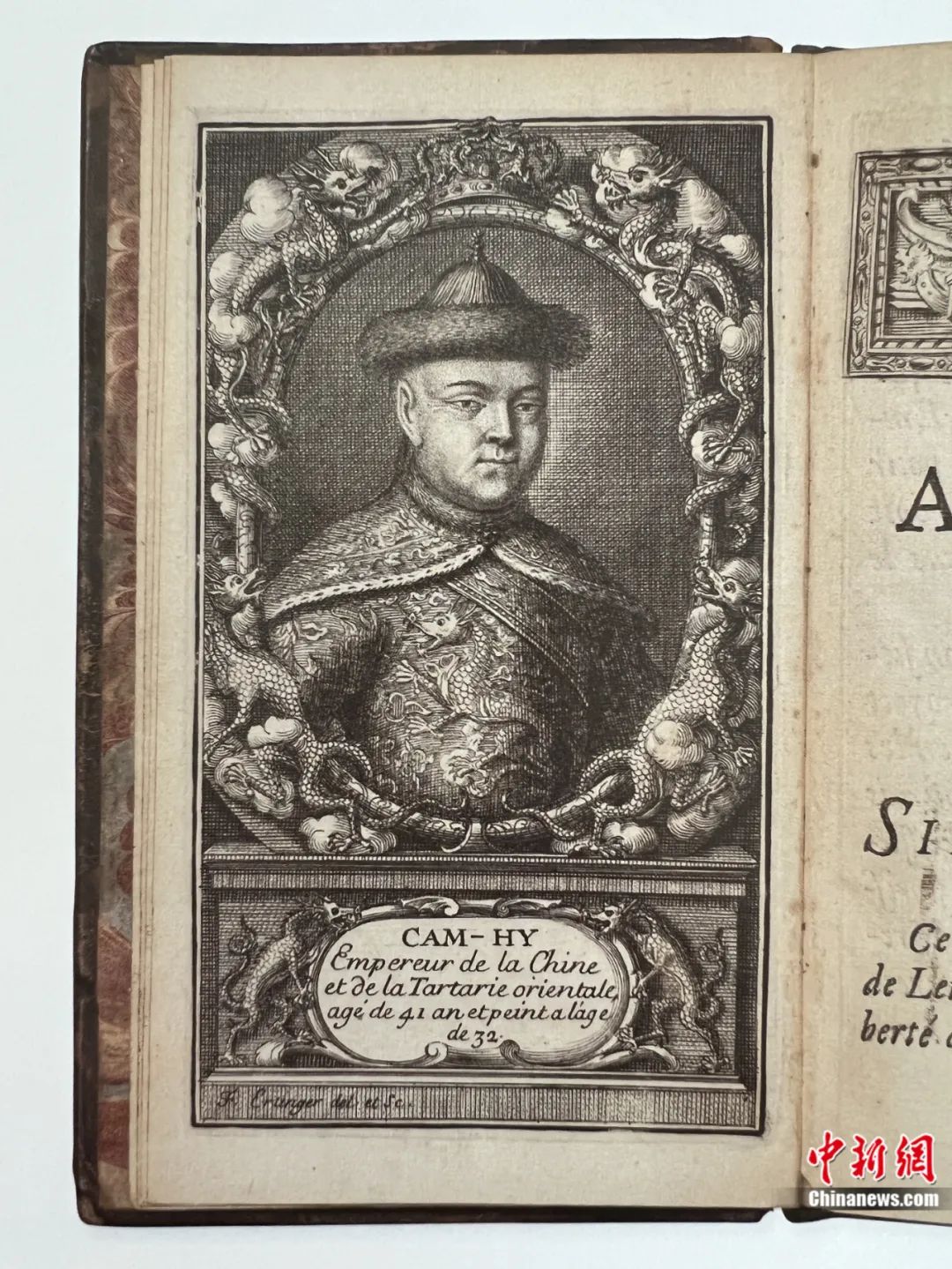 法國傳教士李明(1655-1728),受法國國王路易十四派遣來華傳教,在中國停留數(shù)年后返回歐洲。他在巴黎出版的《中國近事報道》扉頁有一幅康熙皇帝的銅版畫像,可能是歐洲最早公開出版的康熙皇帝畫像。畫像中康熙皇帝衣服的胸部繪著一條行龍,同時畫像四周邊飾以及下面的圖題兩側(cè)均裝飾中國龍的形象。龍的圖案顯然是用來表明畫像中人物的皇帝身份。