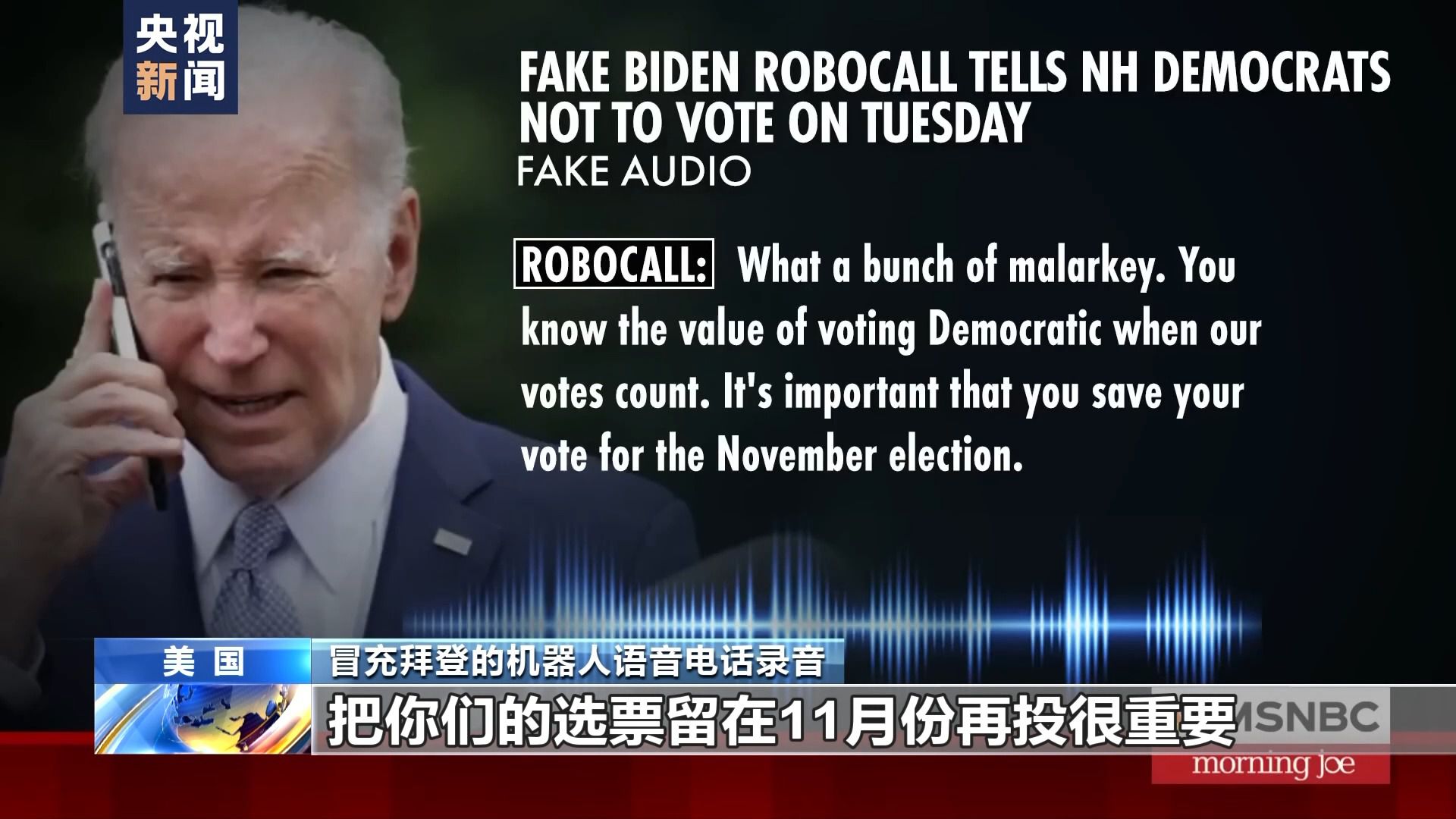 冒充拜登的機(jī)器人語音電話錄音:把你們的選票留在11月份再投很重要。在這周二(23日)投票,只會(huì)讓共和黨人得逞,讓特朗普再次當(dāng)選為共和黨候選人。