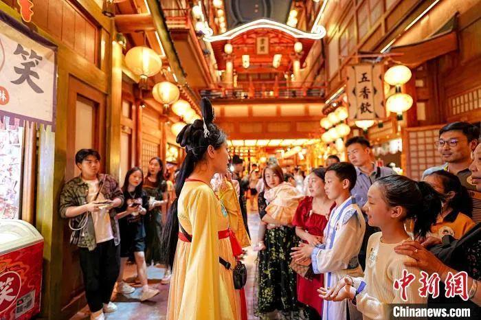 圖為游客在“長安十二時(shí)辰”沉浸式唐風(fēng)市井生活街區(qū)體驗(yàn)、游覽。 滕瀚 攝