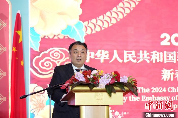 2月2日,中國(guó)駐菲律賓大使館在馬尼拉舉辦龍年新春招待會(huì)。圖為菲律賓代理外長(zhǎng)多明戈現(xiàn)場(chǎng)宣讀菲總統(tǒng)馬科斯新春賀詞。中新社記者 張興龍 攝