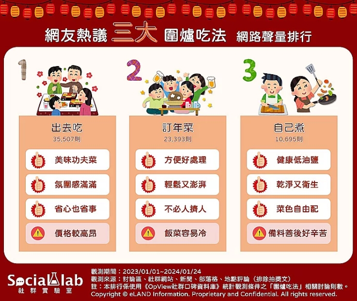農(nóng)歷新年即將到來,而重頭戲之一便是除夕時端上桌的年夜飯!觀察近一年臺灣網(wǎng)友針對“圍爐吃法”相關(guān)話題的討論,可以發(fā)現(xiàn)近年不少人為了避免自行下廚的繁復(fù)工程,紛紛選擇在除夕時出去吃年夜飯,只需一通電話預(yù)約,即可輕松享用美味的菜肴,省心又省事。