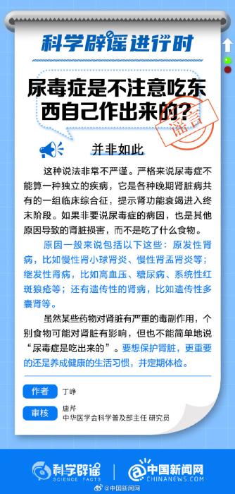 中新網(wǎng)2月7日電 近日有人稱:“中國尿毒癥透析患者已經(jīng)超過100萬了,尿毒癥是不注意吃東西自己作出來的,要想不得尿毒癥,有些食物不能碰……”注意,這些說法沒有科學依據(jù)!嚴格來說尿毒癥并不能算一種獨立的疾病,它是各種晚期腎臟病共有的一組臨床綜合征,提示腎功能衰竭進入終末階段。如果非要說尿毒癥的病因的話,也是其他原因導致的腎臟損害,而不是吃了什么食物。要想保護腎臟,更重要的還是養(yǎng)成健康的生活習慣,并定期體檢。(來源:@科學辟謠 中國新聞網(wǎng)微博)