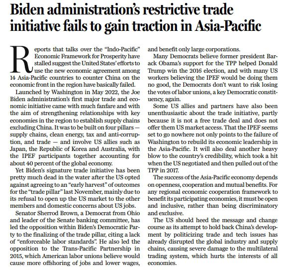 近期的一系列報道顯示,由美國主導的“印太經(jīng)濟框架”(IPEF)相關(guān)談判已經(jīng)陷入僵局。這或許意味著,美國通過所謂“構(gòu)建新經(jīng)濟協(xié)定”、打造14個亞太國家“小圈子”,以求經(jīng)濟層面在相關(guān)地區(qū)抗衡中國的嘗試,基本宣告失敗。