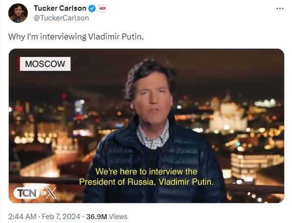 據(jù)介紹,卡爾森是福克斯電視臺(tái)的一名當(dāng)紅主播,主要負(fù)責(zé)一檔名為《卡爾森今夜秀》的新聞節(jié)目。他在2023年4月被??怂菇夤?,隨后在社交平臺(tái)X上繼續(xù)發(fā)布采訪節(jié)目。路透社稱,卡爾森2023年8月在X上發(fā)布的對(duì)美國(guó)前總統(tǒng)特朗普的采訪獲得了上億播放量。