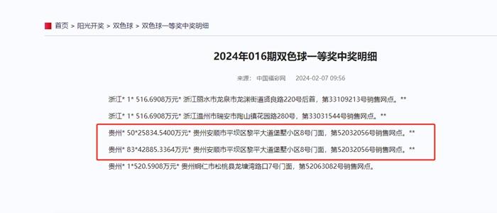 據(jù)中國福彩網(wǎng)顯示,在貴州省安順市52032056號(hào)銷售網(wǎng)點(diǎn)銷售的兩張一等獎(jiǎng)中獎(jiǎng)彩票中,一張彩票一等獎(jiǎng)中獎(jiǎng)數(shù)量為50注,中獎(jiǎng)金額為25834.5400萬元,另一張中獎(jiǎng)數(shù)量為83注,金額為42885.3364萬元。