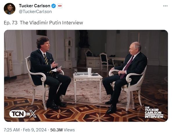 上線前,這場(chǎng)采訪就在世界范圍內(nèi)引發(fā)關(guān)注。有媒體稱,這次采訪或?qū)⒊蔀?022年烏克蘭危機(jī)爆發(fā)后,美國(guó)媒體人對(duì)普京進(jìn)行的首個(gè)正式訪問(wèn)。相關(guān)通告已在社交媒體上獲得了網(wǎng)友的上億次瀏覽量。