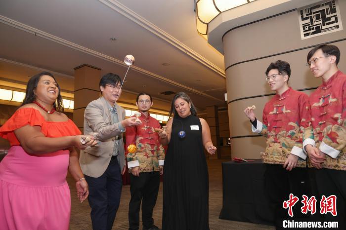2月8日,曾在香港和國際賽事中屢獲殊榮的香港劍球(亦稱劍玉)隊成員(著唐裝者)獲香港駐多倫多經(jīng)貿(mào)處邀請訪加并出席新春酒會時,指導與會嘉賓體驗劍球?!≈行律缬浾?余瑞冬 攝