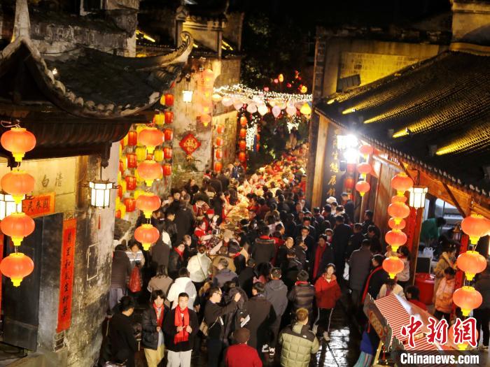 中新網(wǎng)懷化2月10日電 (付敬懿 李林)“開(kāi)席咯,上頭碗,大吉大利,黃精燉雪峰烏骨雞;第二碗,前程似錦,黔陽(yáng)雪粑鴨;第三碗,牛氣沖天,干鍋高山黃牛肉;第四碗,年年有余,黃燜昌齡魚(yú)……”2月9日晚,除夕夜,湖南懷化洪江市黔陽(yáng)古城內(nèi),一張張桌子擺滿大街小巷,當(dāng)?shù)鼐用窈陀慰凸矅L長(zhǎng)龍宴,歡迎龍年到來(lái)。